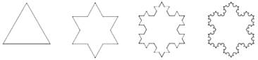 Para hacernos una idea del modo en que esa contradicción estética es superada por los fractales, construyamos por ejemplo la figura de un "copo de nieve fractal" utilizando triángulos perfectos (equiláteros) de acuerdo con la siguiente prescripción. Partimos de un triángulo (primera figura). En el centro de cada uno de sus lados, agreguemos otro triángulo cuyo lado mida un tercio de la longitud original; obtendremos así una estrella de seis puntas (segunda figura). En el centro de cada uno de sus lados, agreguemos otro triángulo cuyo lado mida un tercio de la nueva longitud; obtendremos entonces una estrella radiada (tercera figura). Aplicando una vez más este procedimiento, obtendremos una nueva figura estrellada que ya se asemeja bastante a la estructura microscópica de un copo de nieve (cuarta figura).